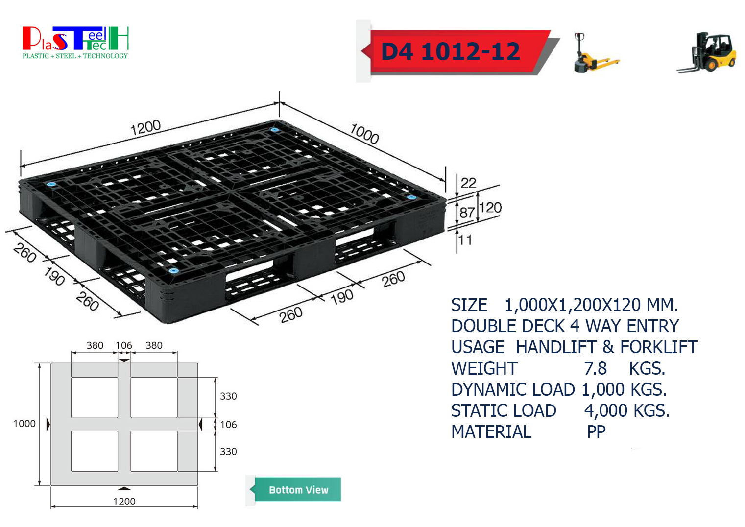 1,000x1,200x120 mm พาเลทพลาสติก วันเวย์