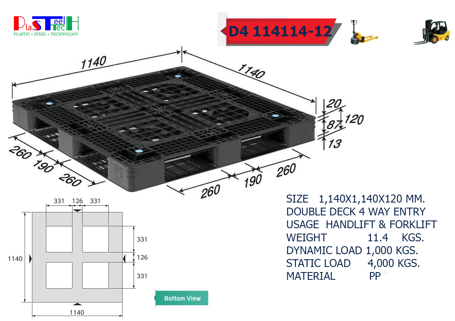 1,140x1,140x120 mm พาเลทพลาสติก วันเวย์