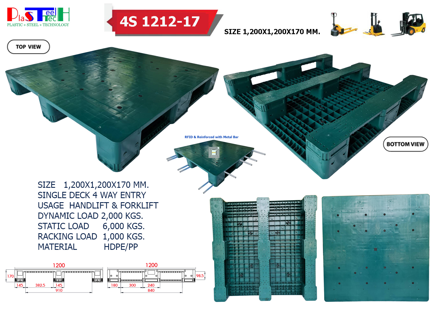 1,200x1,200x170 mm พาเลทพลาสติกเสริมเหล็ก